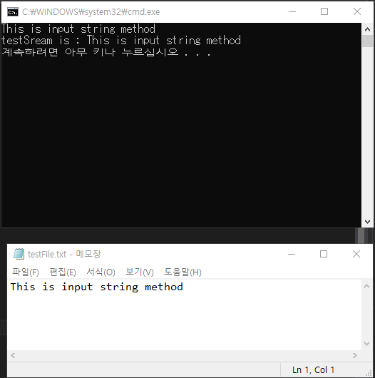 최종 결과는 이것을 실행해 보면 cmd창과 d:\testFile.txt에 아래와 같이 출력됨을 확인할 수 있습니다.